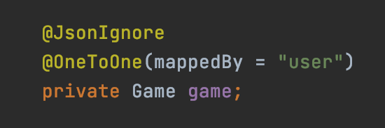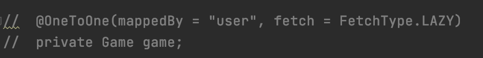 4. 새로운 기능 추가를 위해 game 테이블을 추가로 생성했다. user 와 game은 OneToOne양방향 관계이며 Lazy로딩으로 설정되어있다.
