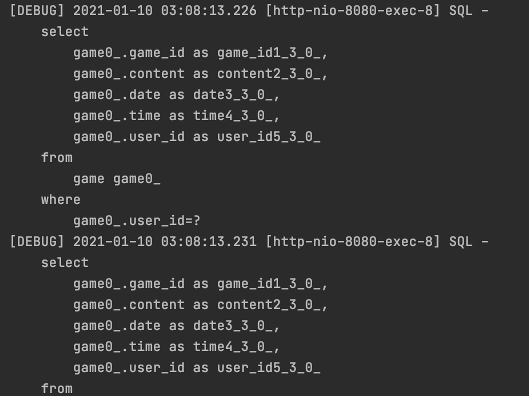 5. game테이블을 생성했는데, 예상하지 못한 곳에서 문제가 발생했다. 게시판을 조회하니 아래와 같은 의도하지 않은 쿼리가 게시글 수 만큼 추가로 발생했다. ( N+1 문제 발생 )